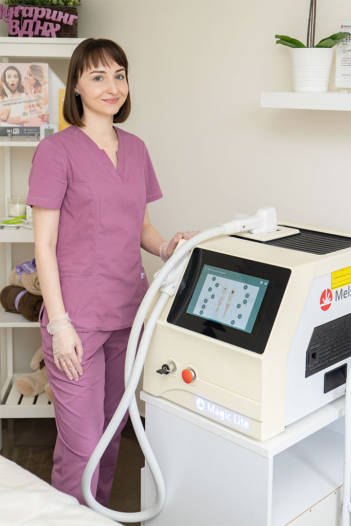 Используем диодный лазер Melsytech Magic, потому что он эффективный и без боли. Сертифицирован и мастера хорошо его чувствуют.